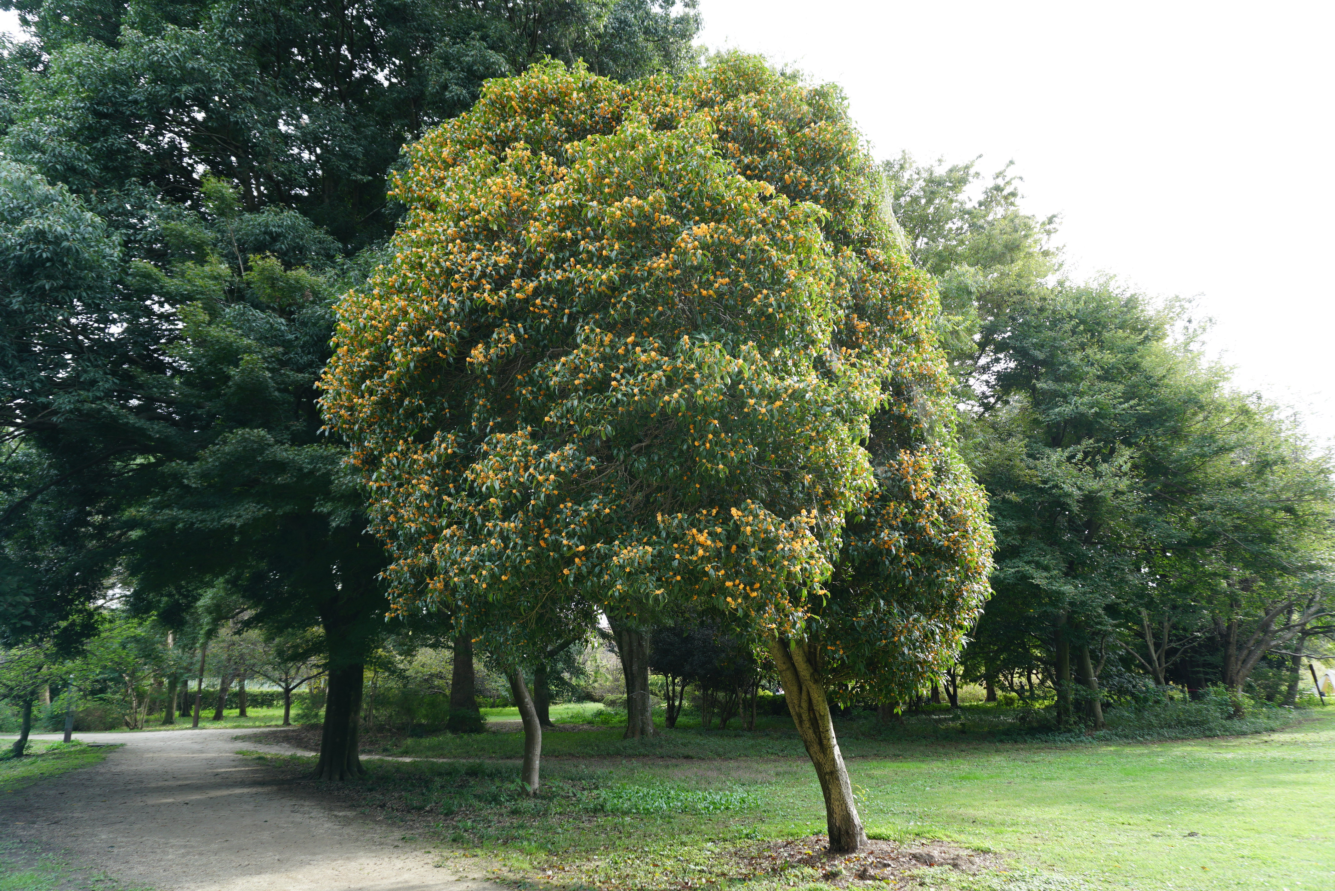 公園内を歩いていると、甘くて良い香りがしてきました。そこには、キンモクセイが咲いていました。キンモクセイの花を見るのは、たぶん初めてです。