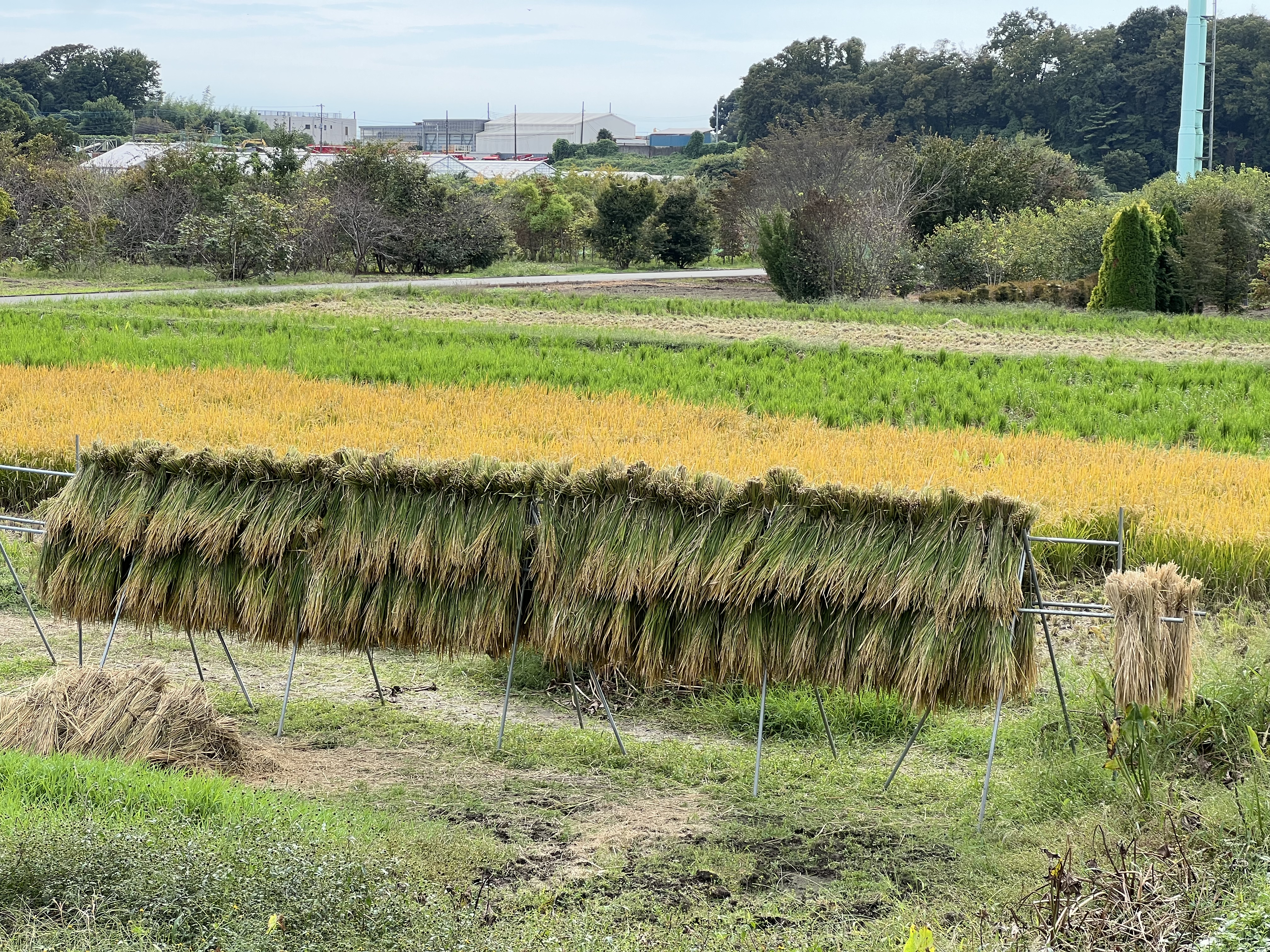 稲刈りを見るのは久々で、稲の色のグラデーションを思い出しました。子供のころからお気に入りの色合いです。