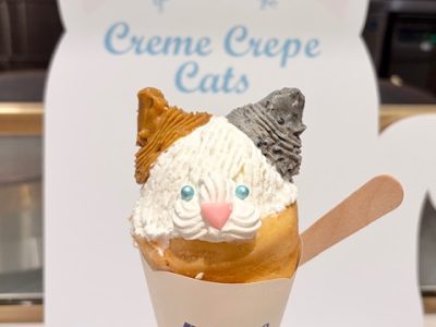 ねこちゃんクレープを食べました! 限定なのがもったいないくらいかわいいです。 2種類あったのですが、三毛猫ちゃんのほうにしてみました。 お耳はキャラメルと黒ゴマの2つのクリームで ...